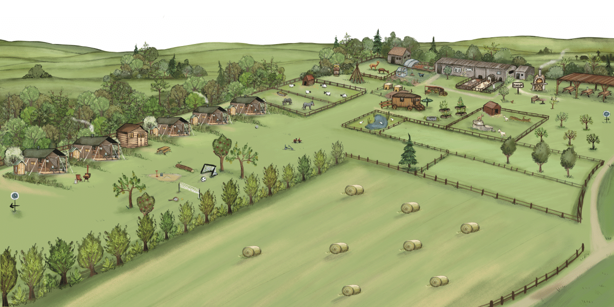 Op het terrein staan vier tenthuisjes voor 4–6 personen verspreid over grasvelden en paden. Hier lopen kippen, geiten en pony’s rond, en kinderen mogen helpen met het verzorgen van kleine dieren of zien hoe het leven op de boerderij vorm krijgt.