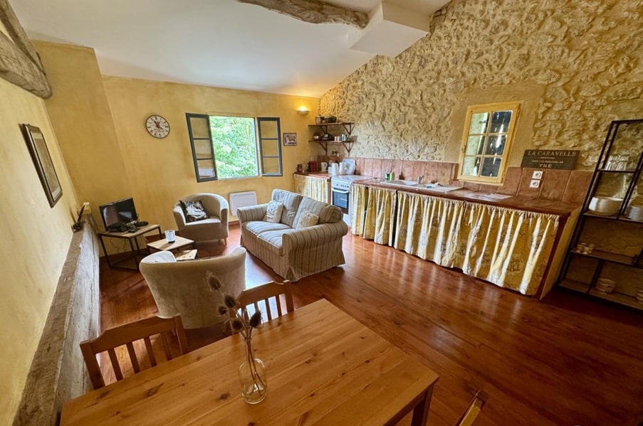 Je logeert hier in een van de 5 gîtes, ieder geschikt voor 4-5 personen + een baby. Elke gîte beschikt over een zithoek met keuken, 2 slaapkamers, een badkamer en een eigen stukje tuin met lounge set en picknick tafel. Ook een heerlijke plek om met familie of vrienden te verblijven. In totaal kunnen hier maximaal 24 personen verblijven.