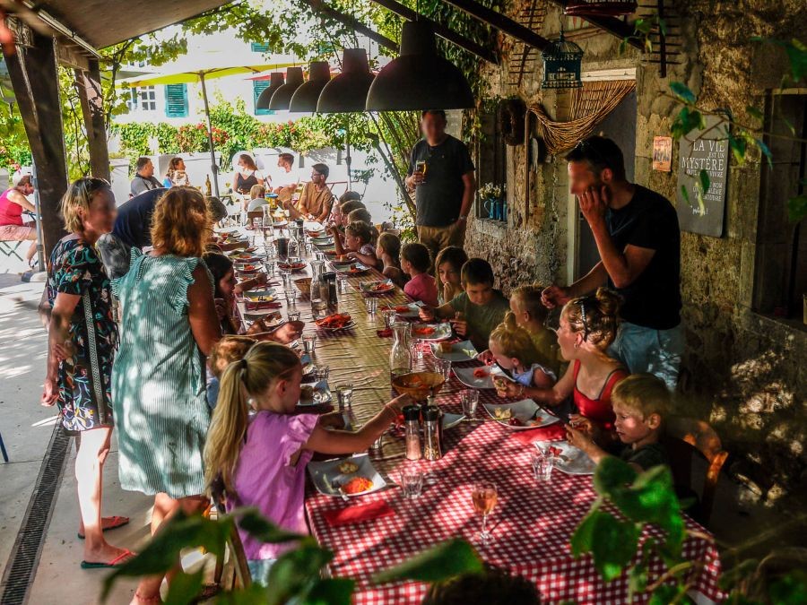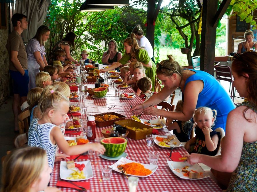 Geen zin om boodschappen te doen? Dan kun je 4 maal per week, samen met andere gasten, aanschuiven aan de table d’hôtes. Hier kun je je laten verwennen met een huisgemaakte Franse maaltijd en na het eten is het mogelijk om na te genieten bij het kampvuur.