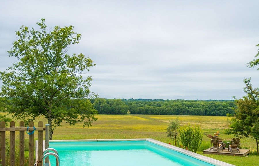 Het zoutwater zwembad (4x8m) is verwarmd (mei-oktober) en heeft een fantastisch uitzicht over het heuvellandschap. Het zoute water voelt zacht aan en is weldadig voor je huid. Het zwembad is voor alle gasten toegankelijk. Je mag hier ook ‘s avonds zwemmen; zwemmen bij volle maan of onder een heldere sterrenhemel is een magische ervaring. Omringd door het warme water, de stilte, de weidsheid en het geroep van de uilen. Rondom het zwembad, in de omliggende tuin staan ligbedden met heerlijke kussens. Voor de veiligheid van de allerjongste gasten is de toegang tot het zwembad beveiligd met een afsluitbaar hek.