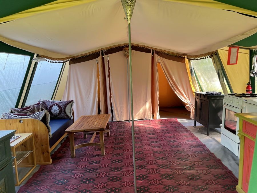 • 8 ingerichte tenten voor 5 personen, waarvan 4 met prive sanitair (toilet en wastafel)(bijplaatsen extra tentje voor kinderen mogelijk)