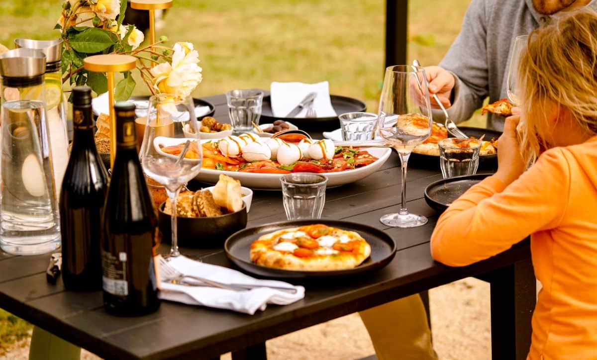 Samen eten en genieten hoort bij het Franse vakantiegevoel. Op het domein vind je een buitenkeuken met grote BBQ  waar lange zomeravonden vanzelf ontstaan. Onder de pergola wordt gekookt, gegeten en nagepraat, terwijl kinderen nog even doorspelen. Zeker in de zomervakantie weken tijdens de wekelijkse ‘soirée pizza’ waarbij Robert en Anne ter plaatste verse pizza’s bereiden. Ook wordt er in de zomervakantie eens per week een table d’hôtes georganiseerd, waarin aan een lange tafel op het binnenplein van de Mas een heerlijk driegangen wordt geserveerd. Tot slot is er een gezamenlijke ruimte met een honesty bar met een selectie van goede lokale wijnen, honing en olijfolie van eigen productie, huisgemaakte yoghurt, groente uit de moestuin, eitjes van de kippen etc.