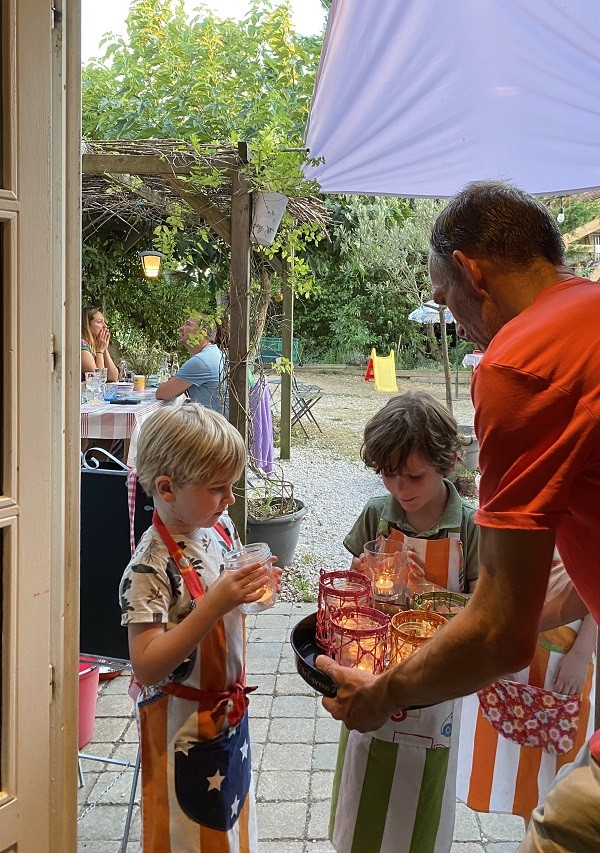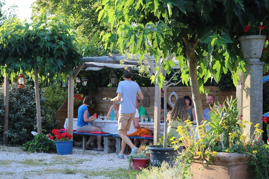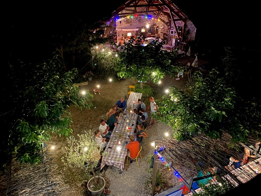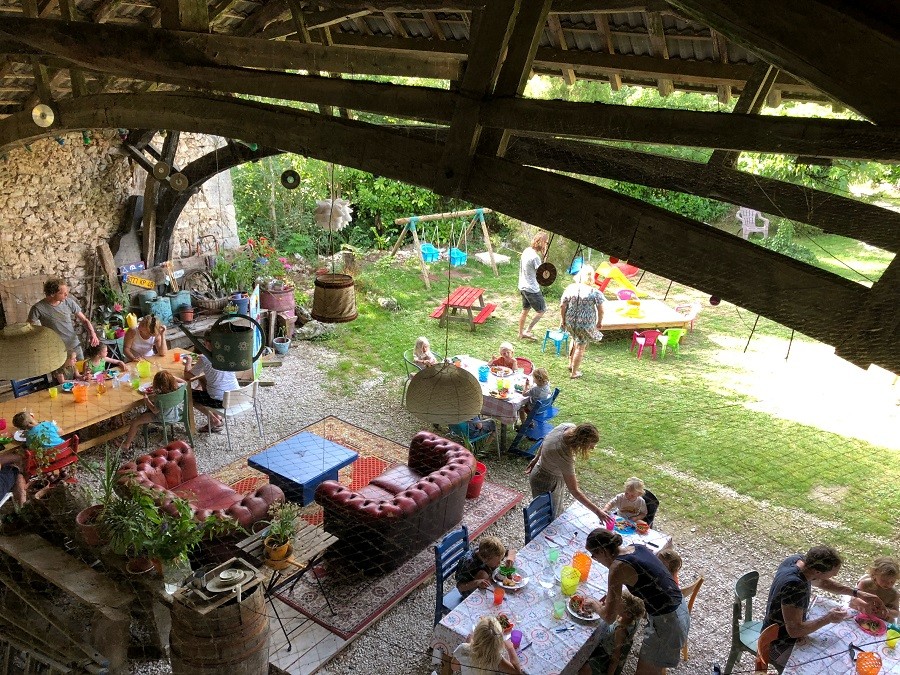 En die sfeer is er al meteen in de ochtend, als alle gezinnen gebruik maken van het ontbijt dat op het erf wordt geserveerd. Lekker de tijd nemen om wakker te worden en te bedenken hoe je de dag gaat invullen. Eén van de vele wandelspeurtochtjes? Een fietstocht? Een markt, kasteel of grot bezoeken? Het is er allemaal! En wij helpen je graag met tips en het maken van reserveringen! Gezellig samen eten in een ongedwongen sfeer is een belangrijke pijler voor Les Escaliers. Vier keer per week is er een table d’hôtes: eerst eten alle kinderen samen, zodat de ouders daarna de rust hebben om lekker van hun eigen diner te genieten (babyfoon op tafel!).