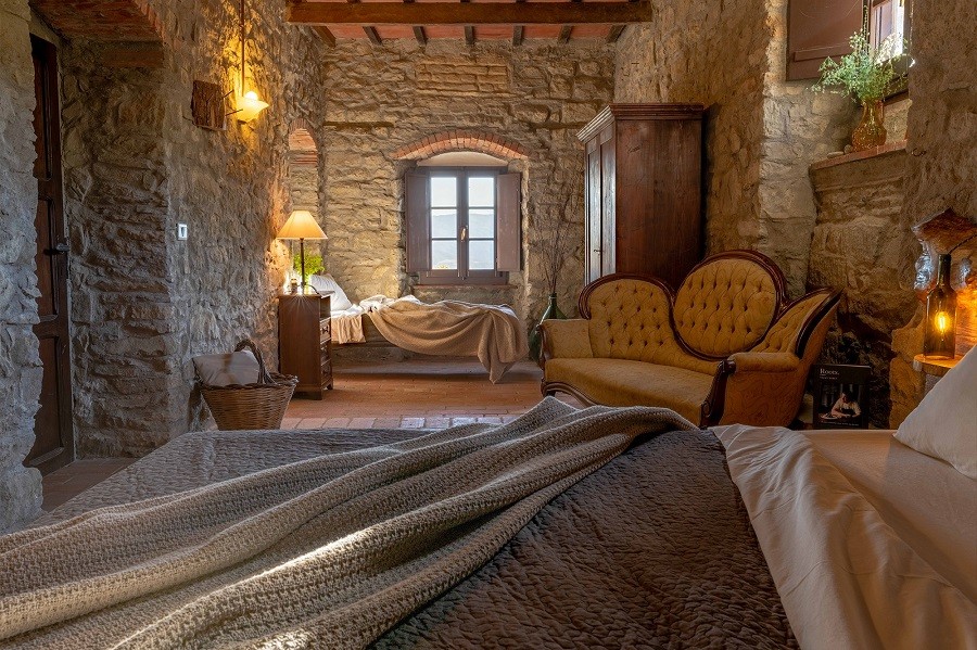 Wat ooit oude Toscaanse boerderijen waren, is nu een gerenoveerd dorpje met 18 knusse hotelkamers (vernoemd naar Italiaanse planten, dieren en bloemen). Daarnaast zijn er 2 luxe villa’s en zelfs een treehouse beschikbaar! Het hoofdgebouw: La Fattoria, beschikt over een lounge en een grote eetkamer met een haard. Ook is er een terras, een klein buiten theater en een infinity pool met cocktailbar. Elke kamer is uniek, heeft een fantastisch uitzicht op de vallei of het bos en is voorzien van een eigen badkamer met een douche en een toilet.