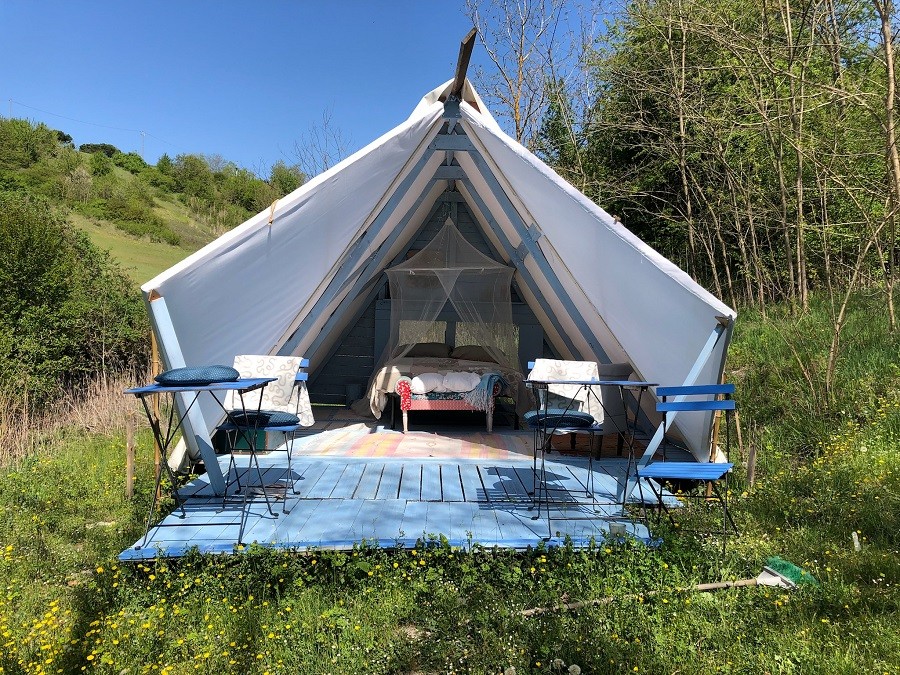 – A Frame Glamping (2-3p): een romantische glampingtent met een prive keuken, douche en toilet en 1200m2 helemaal voor jezelf.