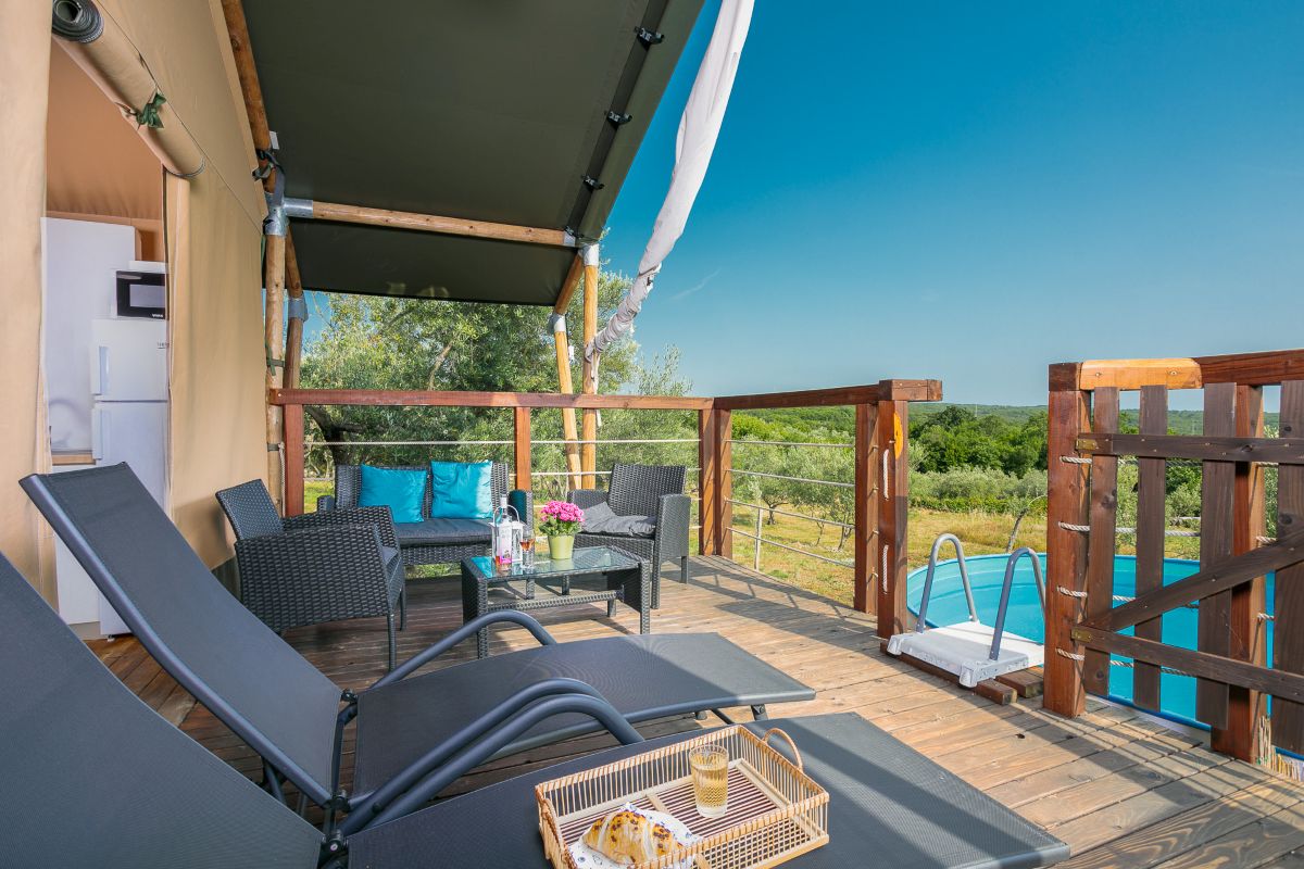 De glamping ligt op het eiland Krk, middenin een groene olijfboomgaard. Er zijn slechts 9 tenten, allemaal apart geplaatst zodat je volop privacy en comfort hebt. Slingerende paadjes lopen door het terrein en een klein beekje stroomt er rustig doorheen. Auto’s blijven aan de rand van het terrein, waardoor het hier veilig, stil en ontspannen voelt. Je hebt alle ruimte om je eigen plekje te vinden en echt tot rust te komen.