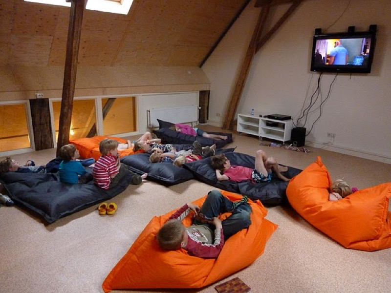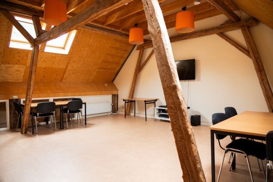 De voormalige Deel (200 m2) is nu de centrale verblijfsruimte met een keuken, eet- en zitgedeelte. Hier zijn de oude gebinten intact gebleven. De helft van deze ruimte is open tot in de nok wat een ruimtelijke sfeer geeft. Boven de andere helft ligt de TV ruimte waar de kinderen heerlijk kunnen spelen en/of chillen.