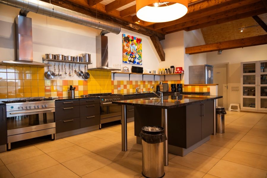 De keuken is voorzien van 2 zes pits gasfornuizen met grote elektrische oven, 2 vaatwassers, 2 koelkasten, kleine vrieskast en in het aanrecht een dubbele spoelbak. Daarnaast is er een eiland met een extra spoelbak en zelfs een bierkoelkast met tapkraan. Verder zijn er koffiezetapparaten, broodrooster, magnetron etc.