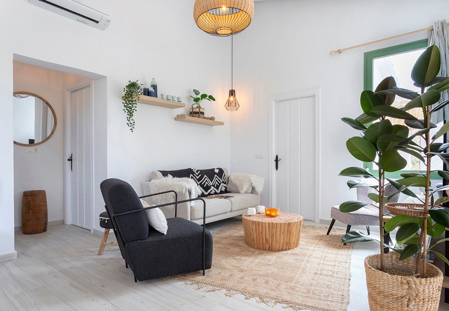 Finca Can Faye is geheel gelijkvloers. Vanwege de grote ramen en vele wit tinten hebben de eigenaren volop lichtinval gecreëerd. De sfeervolle woonkamer met open keuken heeft een sofa, fauteuils en een televisie. De royale eethoek met uniek panoramisch uitzicht is misschien wel de fijnste plek van allemaal. De keuken beschikt o.a. over een koelkast, vriezer, elektrische kookplaat, vaatwasser, voldoende keukengerei etc.