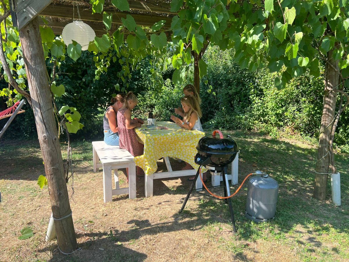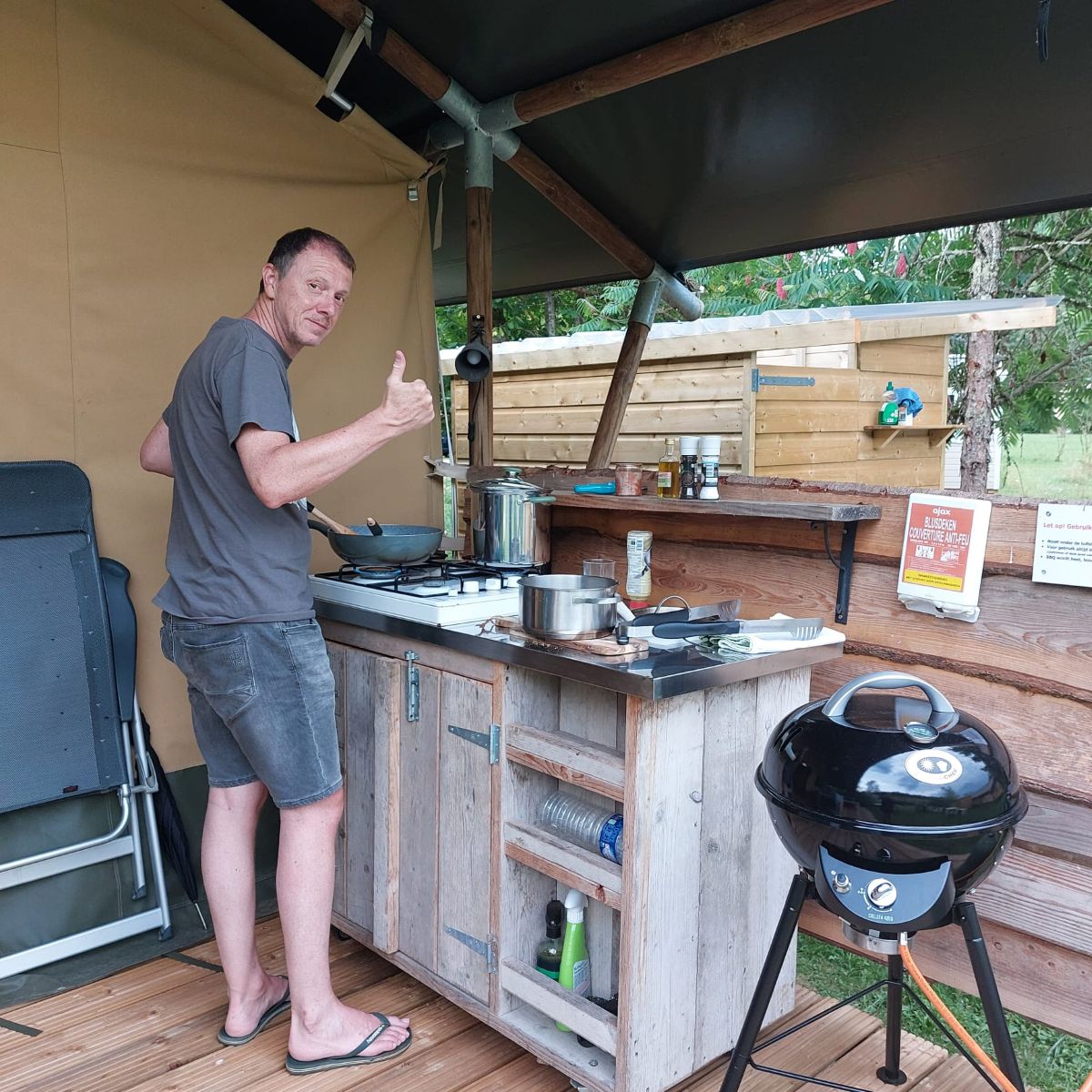 En daar is bij Greencamp goed over nagedacht. De steigerhouten keuken staat op het terras dus je kunt buiten kokkerellen. Verder zijn er loungebanken met comfortabele kussens, 2 verstelbare kampeerstoelen en natuurlijk is er een hangmat.