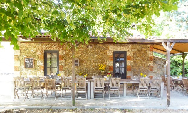 Het wijnhuis is de overdekte ontmoetingsplek waar met elkaar gegeten kan worden en waar je de eigen kasteelwijnen van Bredurière kunt proeven! Bij mooi weer wordt er natuurlijk buiten gegeten op het terras in de kasteeltuin.