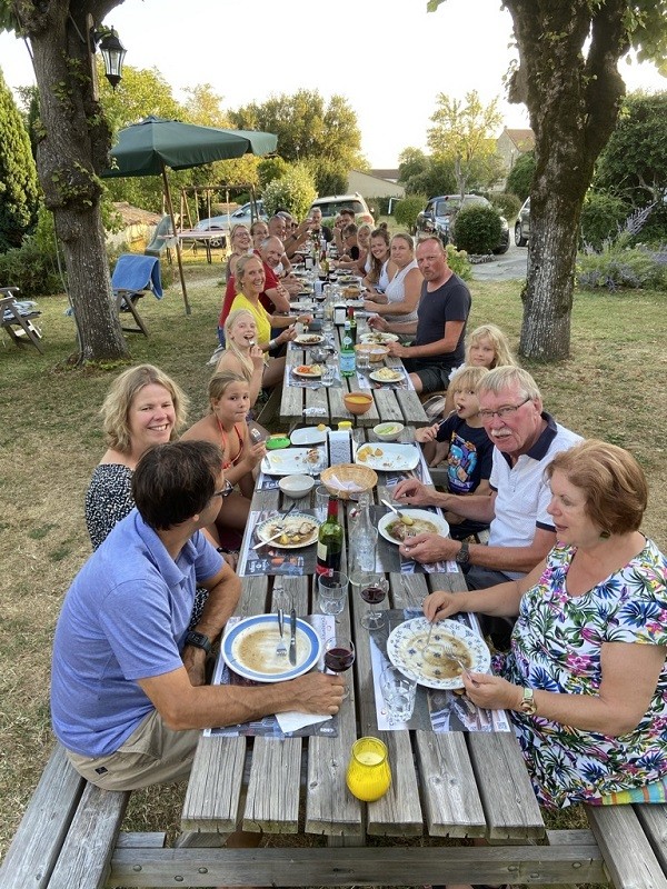 Een aantal keren per week bieden Ilse en Mark ‘table d’hôtes’ en kun je aanschuiven aan de lange picknicktafels onder de lindebomen. Vaak nog net in het avondzonnetje...