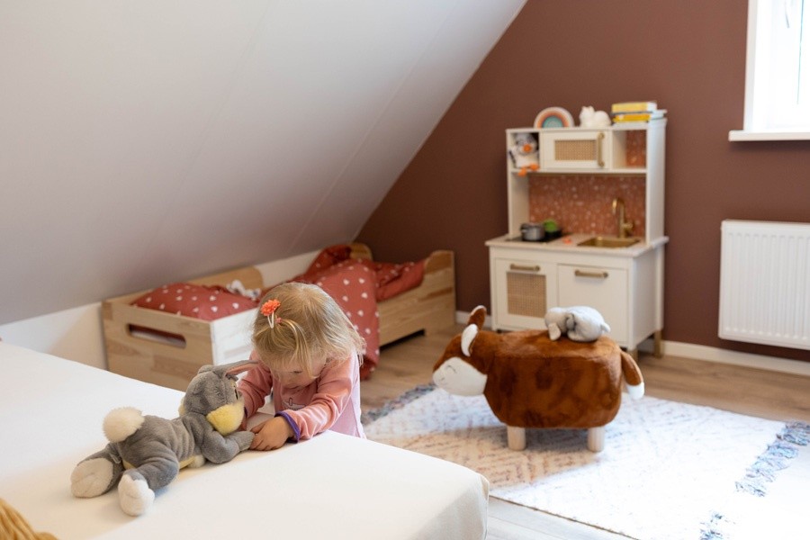 De slaapkamer aan de voorzijde van het huis is echt ingericht voor kinderen; er is een speelkleed, een kinderkeukentje en er zijn leuke spelletjes.