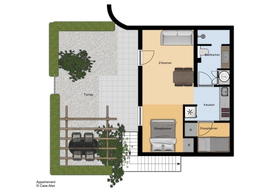 Het onderappartement beschikt over 2 slaapkamers (2 volwassenen + 2 kinderen), een badkamer met grote inloopdouche, een keuken, een zitkamer en privé tuin (8,5 x 5 meter) met een overkapping. In het appartement is airco, WiFi en Google Chromecast aanwezig.