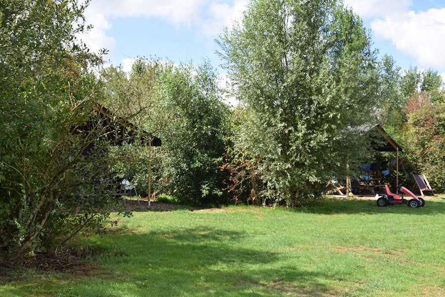 - onder je overdekte veranda vind je een picknicktafel, twee ligstoelen en een barbecue